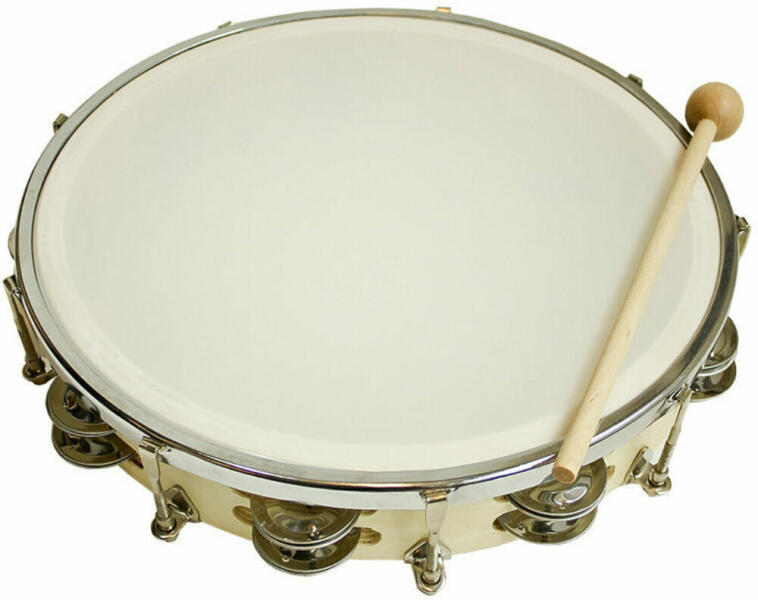 ütőhangszer: hangolható csörgődob, 6 pár csengővel, ütő, fa test
